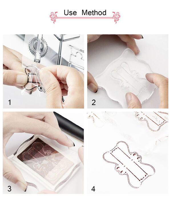 Usage: 1. Take off a pattern. 2. Put on the acrylic. 3.Print ink pad. 4.Print on paper. 5. Finished effect.
