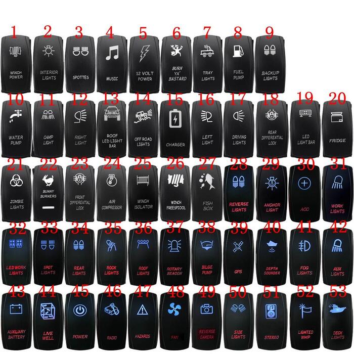 12V 24V BLUE & RED Dual LED Rocker Switch ON OFF 5 Pin Car Boat Marine SUV ATV Specification: 100% brand new!!! Model: 937550 Product Name: Rocker Switch Material: ABS & Environmental anti-retardant materials Color: Black LED Light Color: Blue (up) & Red (down) LED Waterproof Rating: IP65 Switch type: Rocker switch Off/On Pin Number: 5 Pins Operating Voltage: DC12V 20A–DC 24V 10A Fitment: Suitable for all 12 / 24v car battery installation, such as cars, motorcycles, buses, boats, RVs, boats, trailers, etc. Quantity: 1pc 53 Patterns(type):(Please let us know what type you like. You can leave your number/message on your Paypal Note to tell us.) 1. WINCH POWER 2. INTERIOR LIGHTS 3. SPOTTES 4. MUSIC 5. 12 VOLT POWER 6. BURN YA BASTARD 7. TRAY LIGHTS 8. FUEL PUMP 9. BACKUP LIGHTS 10. WATER PUMP 11. CAMP LIGHT 12. RIGHT LIGHT 13. ROOF LED LIGHT BAR 14. OFF ROAD LIGHTS 15. CHARGER 16. LEFT LIGHTS 17. DRIVING LIGHTS 18. REAR DIFFERENTIAL LOCK 19. LED LIGHT BAR 20. FRIDGE 21. ZOMBIE LIGHTS 22. BUNNY BURNERS 23. FRONT DIFFERENTIAL LOCK 24. AIR COMPRESSOR 25. WINCH ISOLATOR 26. WINCH FREESPOOL 27. FISH BOX 28. REVERSE LIGHTS 29. ANCHOR LIGHT 30. ACC 31. WORK LIGHTS 32. LED WORK LIGHTS 33. SPOT LIGHTS 34. REAR LIGHTS 35. ROCK LIGHTS 36. ROOF LIGHTS 37. ROTARY BEACON 38. BILGE PUMP 39. GPS 40. DEPTH SOUNDER 41. FOG LIGHTS 42. AUX LIGHTS 43. AUXILIARY BATTERY 44. LIVE WELL 45. POWER 46. RADIO 47. HAZARDS 48. FAN 49. REVERSE CAMERA 50. SIDE LIGHTS 51. STEREO 52. LIGHTED WHIP 53. DECK LIGHTS Feature: – Black hard surface rocker. – Ultra-high-end luxury switch with LED indicator light – Single pole single throw ON-OFF switch – CE certified quality, made of environmentally friendly anti-retardant materials – 12-24v car universal voltage; suitable for conversion control car people all equipment – Output circuit protection, overload protection, reverse polarity protection, multiple protection, safety to use. Note: 1. (IMPORTANT) No Instructions Included.Professional Installation Is Highly Recommended! 2. Please check the size measurement chart carefully before making payment. 3. Please allow 0.5-1 inch difference due to manual measurement.(1 inch=2.54cm) 4. The color of the actual items may slightly different from the listing images due to different computer screen, thanks for your understanding. Package includes: 1x Rocker ON-OFF Switch