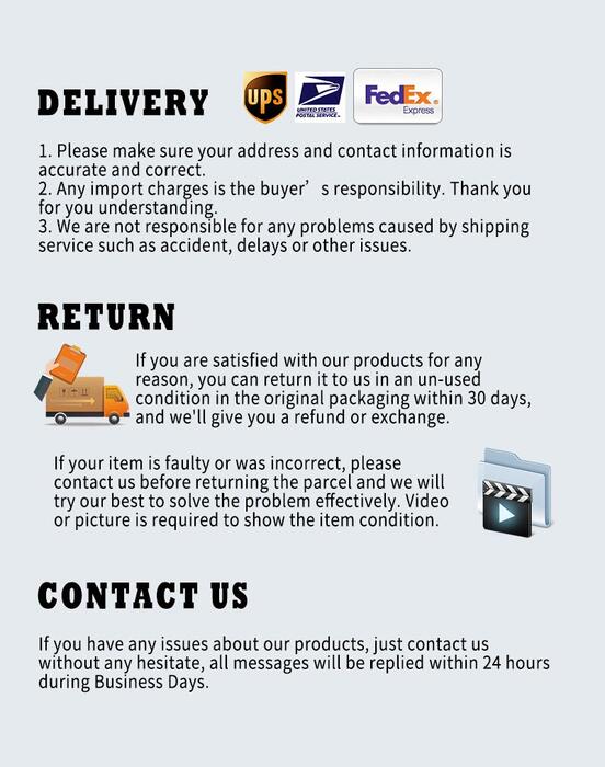 1 year warranty for any manufacture defect.Please provide photos or videos to apply for warranty.