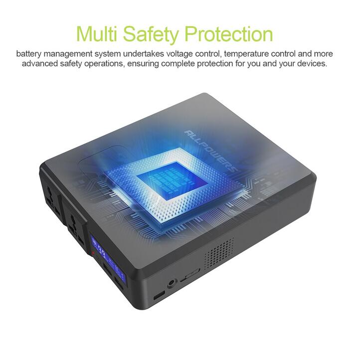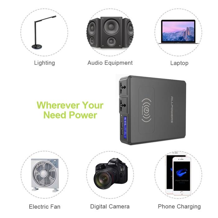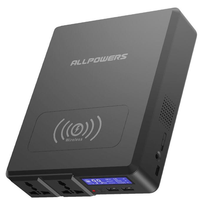 {infomodule} Description: Boasting a remarkable 154 watt-hours of energy, using only premium components and the most advanced power management technology, ALLPOWERS solar generator packs enough power to fully charge your personal electronic devices, household electronics and appliances, jumping start your cars, powering up your tools, and helping you keep lights on for emergency use, charging your laptops, cell phones. It’s great to take in your RV, campsites, fishing, hunting, farm or the job sites 1. Portable Generator: with Max 154W & 110V AC output , you can get a continuous power supply for outdoor using or emergency backup, supplying power for lamps, phones, laptops, TVs ,mini fridges, CPAP and even any devices up to 154W 2. Charging mode: Fully charged in 8 hours by being plugged into wall outlet, it can also be charged by plugging into your car 12V socket. (Car charger included) 3. Update power: The SereneLife generator has a upgraded powerful power capacity, 41600mAh, more built in USB, Type-C and DC/AC ports, perfect emergency power backup for home, travel, camping, backseat on long road trips. 4. Safe and Reliable: Battery Management System (BMS) prevent over-current, over-voltage, over-temperature and short circuit protections, providing complete protection for you and your devices Feature: Battery Capacity: 154Wh/41600mAh Output Waveform: modified sine wave Protection Circuit: Short circuit, over current, over power, over charge, over-temperature, ect Size: 20*17*5cm/ 7.87*6.7*1.9inch Net Weight: 1.35kg/ 48.11oz INPUT: AC Input: AC 110V 50Hz Solar Charger Input: 12V-18V2A(Max.) Output: AC Output x 2: AC 110V 50Hz USB Output x 2: 5V3A Type-C Output: 5V3A DC Output: 9V-12V/15V(Max.) Wirless Output Port: 5V2.4A(Max.) Package Included: 1 X ALLPOWERS Power Station 1 X Charge Adapter 1 X User Manual