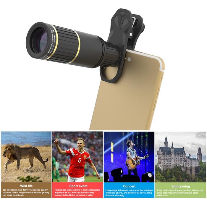 16x telescope lens allows you to get 16x as close to the object, it is used for taking shots of the item from a far distance, and the focus is adjustable.