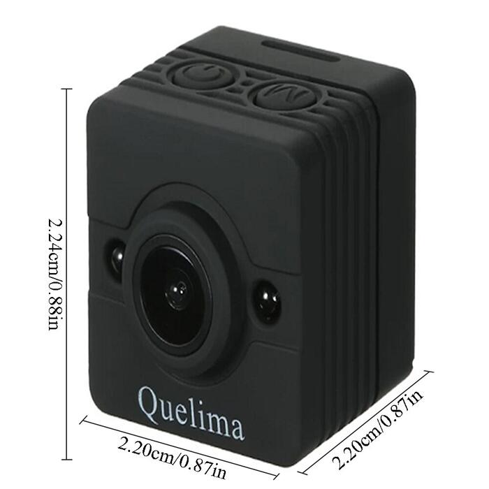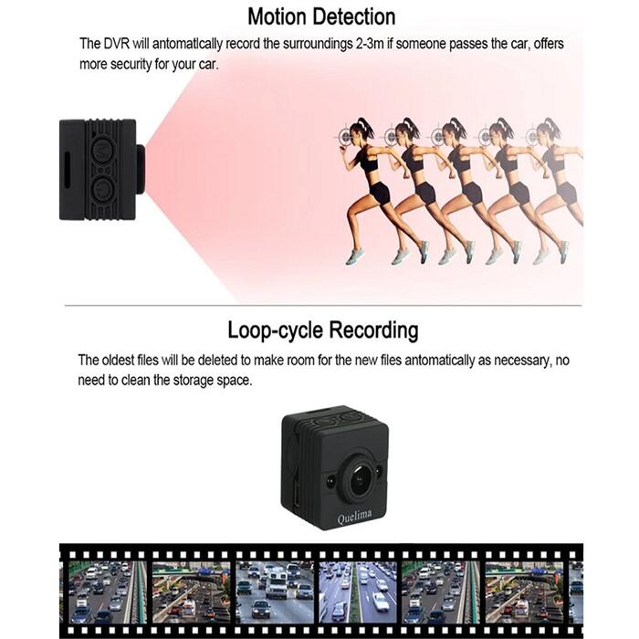 For Quelima SQ12 Mini 1080P FHD DVRBrand: Quelima Model: SQ12 Type: Full HD Dashcam,Mini DVR Chipset Name: Generalplus Chipset: Generalplus1248 Image Sensor: CMOS Features: Full HD,Mini Function: Loop-cycle Recording,Motion Detection,Night VisionStorageMax External Card Supported: TF 32G (not included) Class Rating Requirements: Class 10 or AbovePowerBattery Type: Built-in Battery Capacity (mAh): 200mAh Charge way: Car charger Working Time: 60mins Battery Charging Time: 2H Working Voltage: 3.7VPrimary Info.Wide Angle: 155 degree wide angle Lens Size: 2.33MM Camera Pixel : 1.2MP Aperture Range : f2.5 ISO: AutoVideo/Image/AudioDecode Format: H.264 Video format: AVI Video Resolution: 1080P (1920 x 1080),720P (1280 x 720) Video Frame Rate: 30fps Video Output: Mini 8 pin USB Image Format : JPEG Image resolution: 12M (4032 x 3024) Audio System: Built-in microphone/speacker (AAC)FunctionsWIFI: No Waterproof: No Waterproof Rating : 0 Loop-cycle Recording : Yes Loop-cycle Recording Time: 5min Motion Detection: Yes Motion Detection Distance: 2 - 3M Night vision : Yes Night Vision Distance: 3 - 5m GPS: No Delay Shutdown : No Interface Type: Mini USB,TF Card Slot Anti-shake: No Parking Monitoring: NoOtherOperating Temp.: 10 - 50 Deg.C Apply To Car Brand: Universal Power Cable Length: 60cmDimension/WeightProduct weight: 0.0160 kg Package weight: 0.0830 kg Product size (L x W x H): 2.20 x 2.24 x 2.20 cm / 0.87 x 0.88 x 0.87 inches Package size (L x W x H): 14.00 x 9.00 x 6.00 cm / 5.51 x 3.54 x 2.36 inchesQuelima SQ12 Mini 1080P FHD DVR155 degrees FOV angle, provides optimal and safer view sight and benefits reversing car. Distinctive functions of motion detection and loop-cycle recording will bring you a more comfortable, safe and worry-free driving environment. What s more, it s mini body and compact size, added 200mAh capacity, which can continuously record 60mins, also widely used for outdoor activities. You deserve owning it! Main Features:? 1920 x 1080P FHD resolution, clear image recording? 2 IR LEDs increase night vision effect, which supports capturing high definition pictures during night or dark environment? Advanced H.264 photography compression technology keeps high-quality videos and plays a part of saving storage as well? Time stamp is conducive to look through? Support maximum 32GB TF card memory storage ( not included )? 2 - 3m motion detection