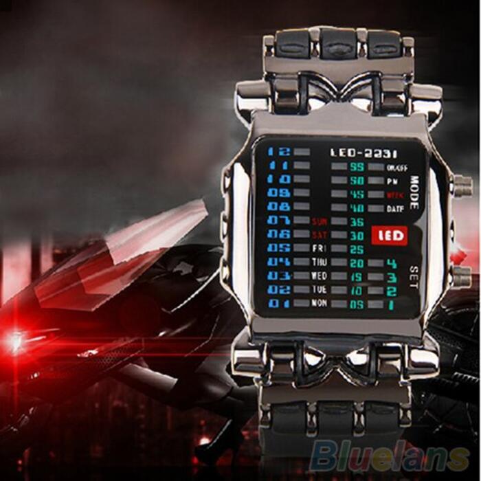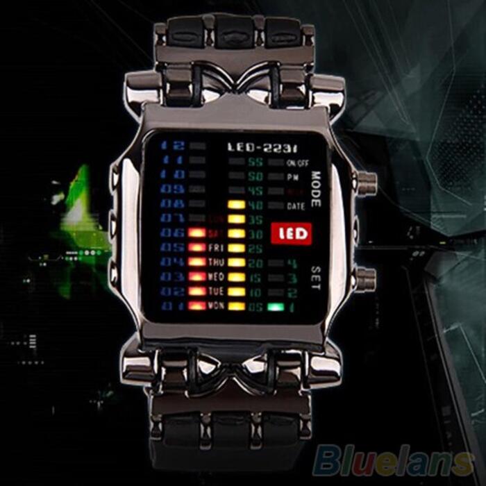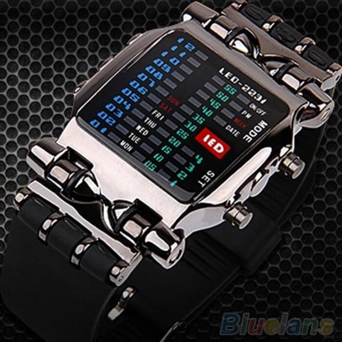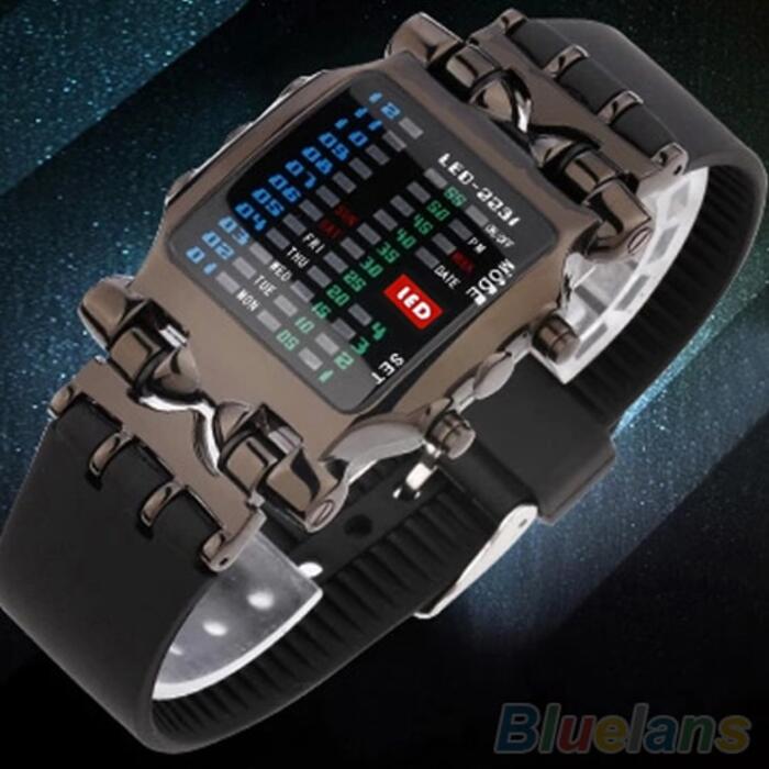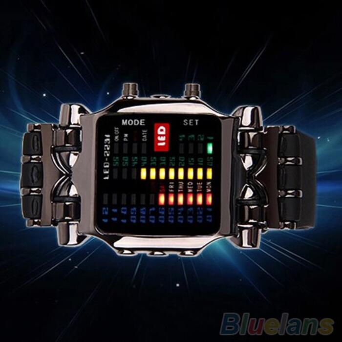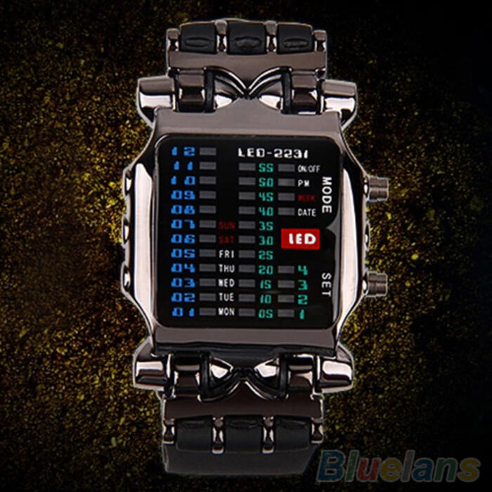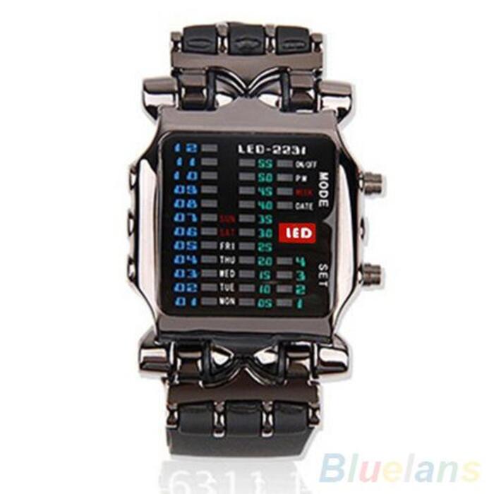 Unisex Binary LED Digital Date Square Dial Casual Sport Plastic Band Wrist WatchSpecial square dial, creative binary display, this black color wrist watch is a cool and charming accessory for both men and women.Time Settings:Please press A button to wake up the watch, then press B button. Number flash, press A button to adjust. Press once to adjust hour,press twice to adjust minute, press three times to adjust month, press four times to adjust date, press five times to adjust week,press six times to adjust brightness, press seven times to wake up automatically.How to read:Number “01 – 12” means hour, number “05 – 55”, “1”,”2″,”3″,”4″ means minutes.Time will show like this: if the current time is 12:48, then the hour number “12”, minute number “45”, and minute number “1,2,3” will light.Date will show like this: if today is May. 12th, the letter “DATE” will light, and hour number “05”, minute number “10”, “2” will light.Day will show like this, if today is Friday, the letter “WEEK” and hour number “05” will light.Gender: Men s Women sStyle: Casual, SportBand Material: Plastic (Poly Urethane)Case Material: AlloyCase Shape: SquareMovement: Battery (Japanese Movement)Display: DigitalLED Color: ColorfulWaterproof: NoCase Length: 4.5cm/1.77″ (Approx.)Case Width: 3.7cm/1.46″ (Approx.)Case Thickness: 1.1cm/0.43″ (Approx.)Band Width: 2.2cm/0.87″ (Approx.)Total Length: 26.5cm/10.43″ (Approx.)Functions: Date, Week, Time, Brightness AdjustmentFeatures: Square Dial, Binary LED Display, Japanese Movement Package Includes:1 x Wrist Watch