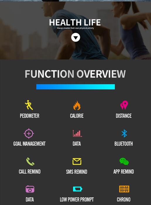 Feature: Fitness Tracker,Message Reminder,Call Reminder,Stop Watch,Back Light,Shock Resistant,Luminous,Chronograph,Water Resistant,Alarm,Bluetooth,Week Display