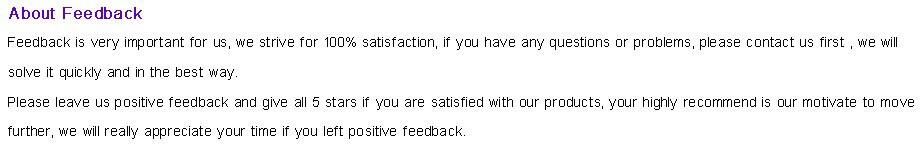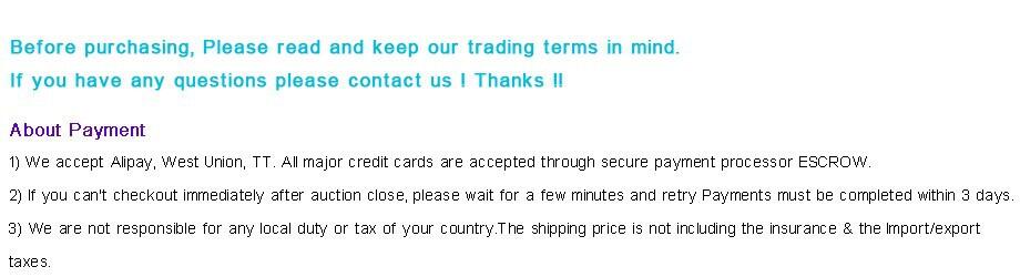 Note 1. Shipping costs shown include fuel surcharges. But Import duties, taxes and other customsrelated charges are not included. Buyers bear all responsibility for all extra charges incurred (if any).Shipment to United States,United Kingdom,South Korea,Japan,Australia,Singapore will NO EXTRA CHARGES 2. The picture is only for reference,the price is1 Piece