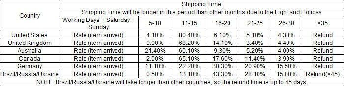 Note: China Post Air Mail/Parcel just belongs to worldwide post system which is much slower than Special Delivery. Items will arrive in 7-25 business days to worldwide usually. And the arrival time also depends on some factors and different areas. The general arrival time table is shown below for your inference: