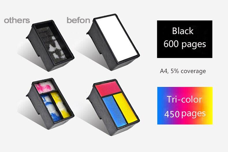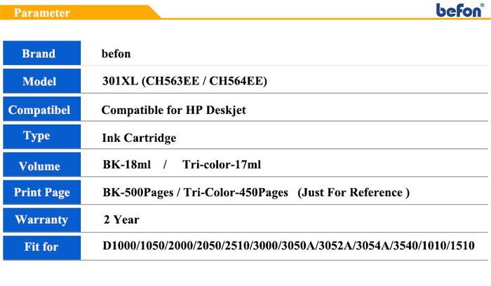 Brand: befon Model: 301XL (CH563EE , CH564EE) Color: BK, Tri-color( C / M / Y ) Volume: BK-18ml, Tri-color-17ml Page Yield: BK-600 pages, Tri-color-450 pages (A4 format, 5% Coverage) Pack: 2-pack (BK/1PCS + Tri-color/1Pcs ) Features: Remanufactured, Refillable, Large Capacity