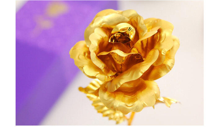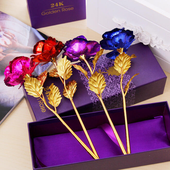 Features : Color : Gold / Purple / Red / Blue Golden Flower Valentine s Day Gift Gold Leaf Rose material : gold foil packaging specification: 27 * 10 * 7 cm Come with a box . The rose flower is not made of real gold (real gold is much more expensive),is plated in golden color. Gift is very important for you,we will make sure of each item packed well and in a good condition. Package : 1 piece X Rose with gift Box