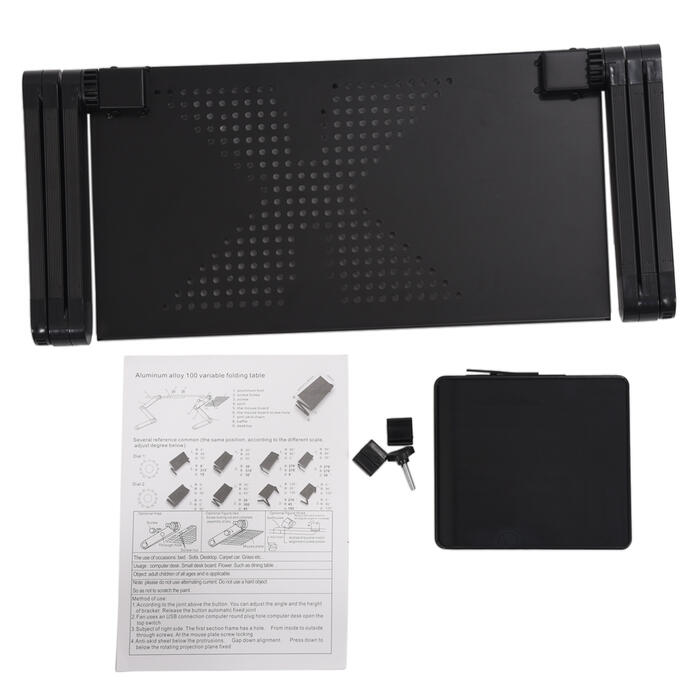 Flexible portable Laptop Notebook desk; Foldable in desk and legs, small in volume, easy to take, easy to use; Desk made of metal with a plastic mouse platform; Legs made of metal with plastic cores Ergonomic sleek design with multi-functional concept; The use of occasions: bed, sofa, table, carpet, meadow, desk, etc. Object: to adults, children, and all the crowd Two black non-slip baffles can prevent the computer sliding; Panel with ventilation holes helps the computer dissipate heat in time. Usage: computer desk, writing desk, Sketchpad,board, dining table,Flower Stand,etc. Made with strong ABS plastic and aluminum alloy achieve the high quality and compact design one. Each folding leg has 3 knobs which can adjust any height and angle you need. The 360°revolve provides the high flexibility just as human. High strength ABS plastic joint,combined with high-tech screen printing scale, convenient your adjustment.