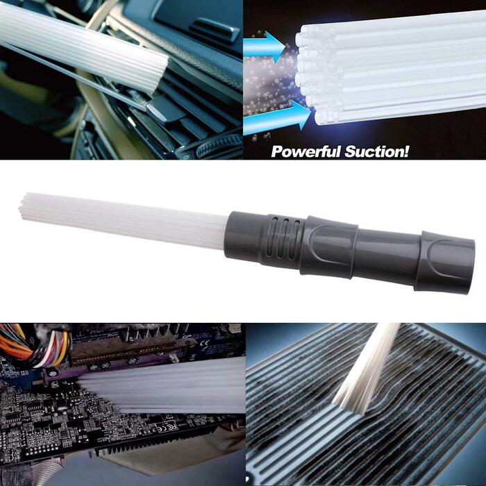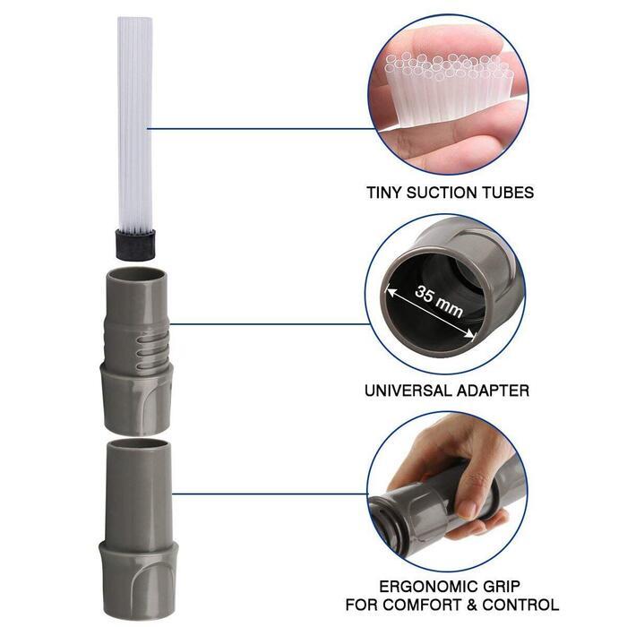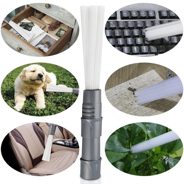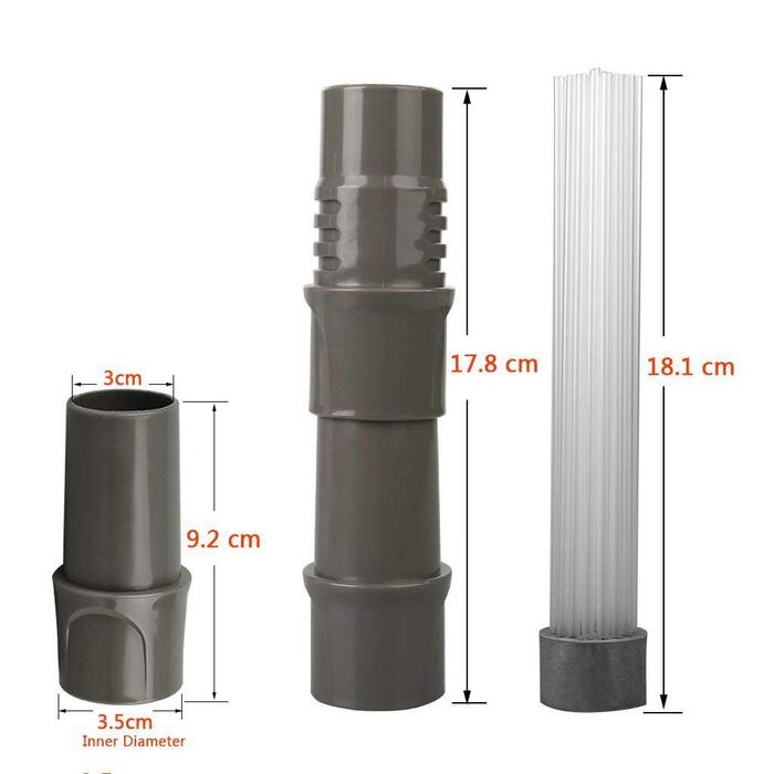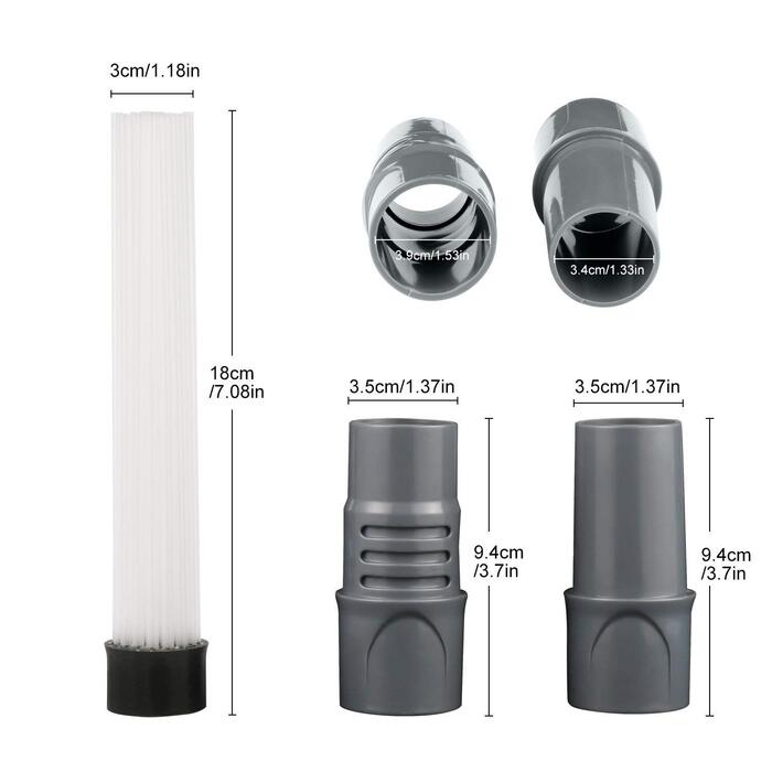 (get rid of dust that could not be reached) the cleaning brush is perfect for cleaning sewn, keyboards, drawers, curtains, furniture, cars and others. The cleaning brush is the best cleaning tool you have ever owned.(Unique design) the brush for cleaning is specially designed with 36 micrometrici flexible suction tubes, 0,16 mm Weight, total length 13 inches. The cleaning brush is suitable for: Vacuum cleaner tube 35 mm internal diameter.(convenient to use) the brush for cleaning can be tied directly to the vacuum cleaner. It is not necessary to transfer things before spraying, perfect for cleaning fragile items.(universal tip) Vacuum accessory can work with all vacuum cleaners. The exclusive suction device designed to remove dust from every corner of the house.Color: GrayMaterial: PlasticPackage Content:1 * vacuum connectorOnly the above package content, other products are not included.Note: Light shooting and different displays may cause the color of the item in the picture a little different from the real thing. The measurement allowed error is +/- 1-3cm.