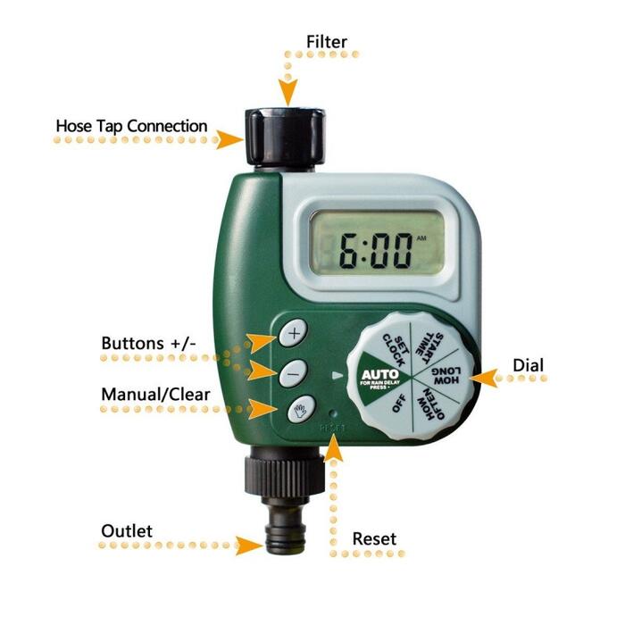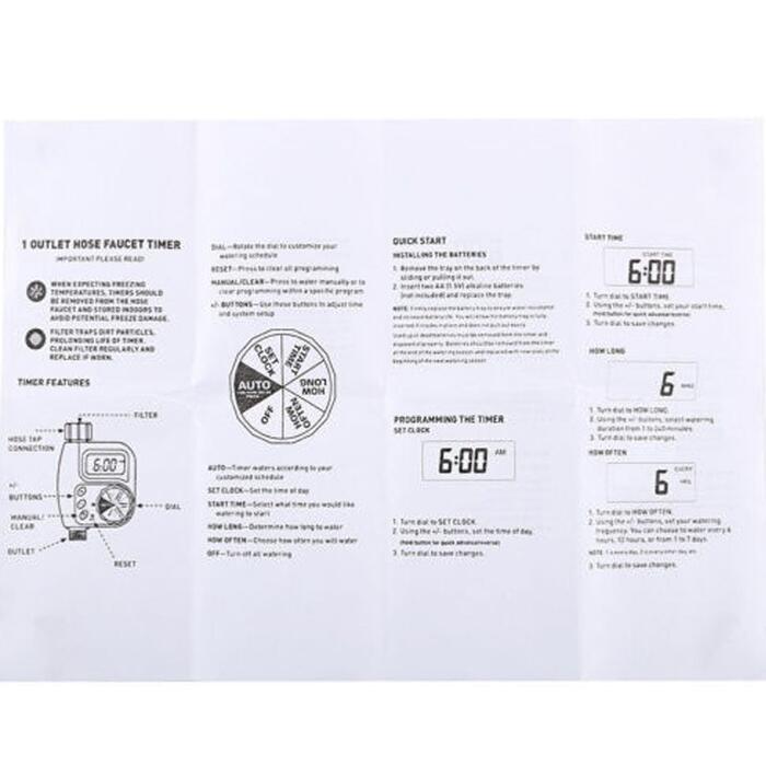 Precautions Using two alkali / carbon 3 volt battery;; Suitable for 0-8 kg water pressure; Suitable for water temperature of 0~ 40 You can set the specific water time and set the current specific time. there is a temporary watering function (no impact on the set of procedures) how to use: 1. Turn the dial to set the appropriate program according to individual needs. specification: Color: as shown Material: Material size (L x W x H): 10x10x6.5 cm Thread size: 2 cm Outlet Screw Diameter: 2 cm, 1 cm suitable water temperature: 0 to 40 degrees degrees celsius Working pressure: 0.0-8 kg Watering time: The minimum time for water is one minute, and the longest time is 300 minutes. Power supply: 2×3 V, AA battery (Batteries are not included in the package) Package List: 1 x Digital Garden Irrigation Controller (Batteries are not included in the package) 1 x Manual in English notice: 1. Please allow 1-3 cm of error due to manual measurement, make sure you do not care before you bid 2. Colors may be different for different display, please understand