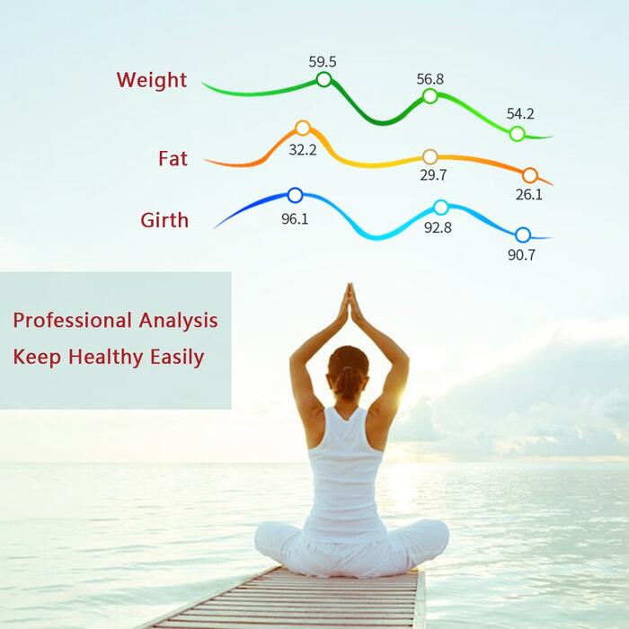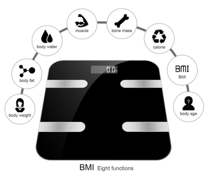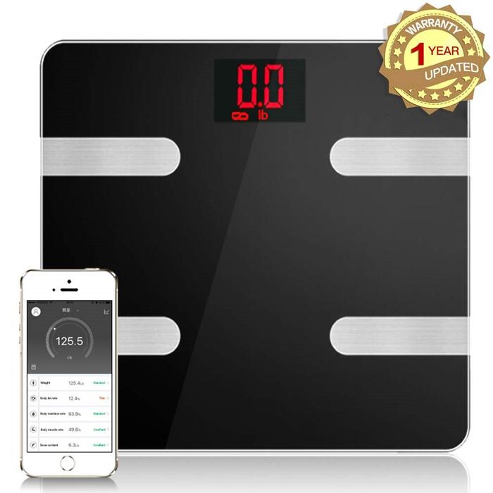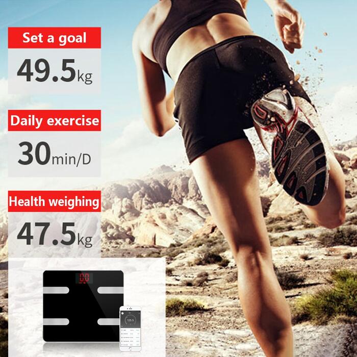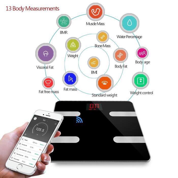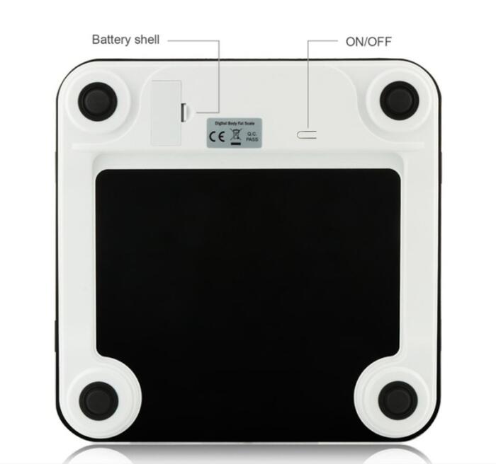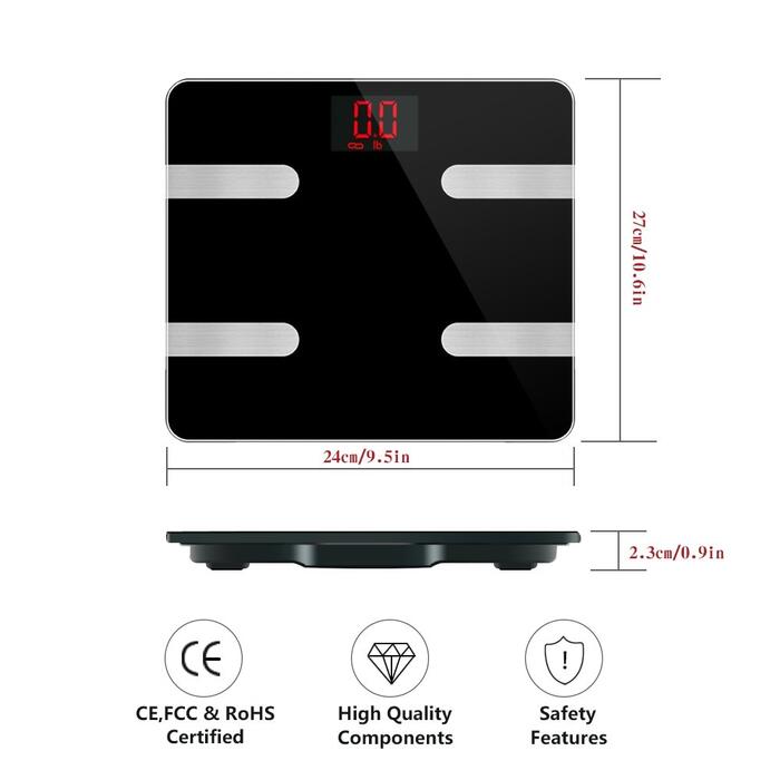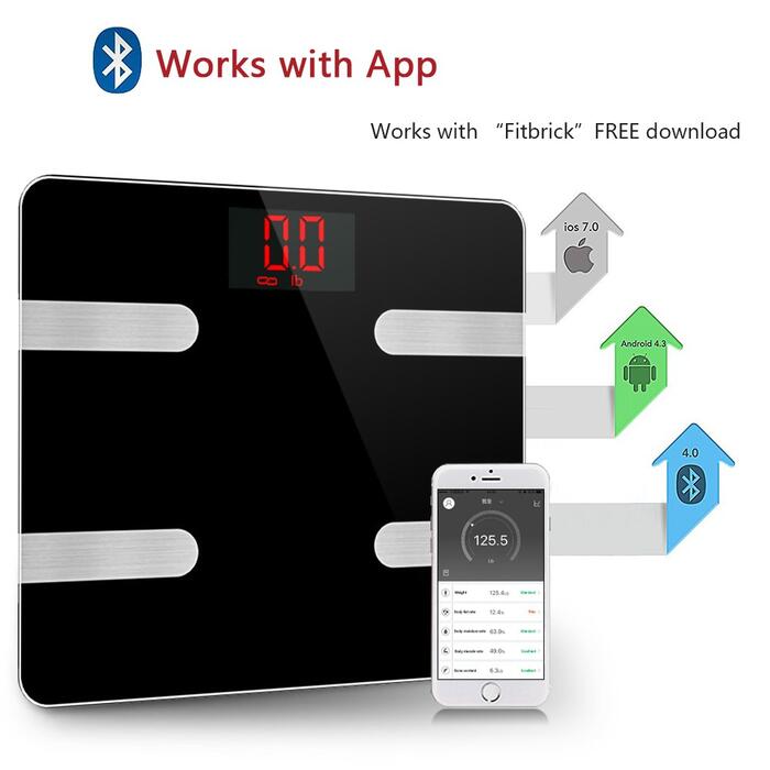 Product description –Measurements :Body Weight, Body Water, Body Fat, BMI, BMR(KCAL), Muscle Mass, Bone Mass, Body age and Visceral Fat.(scale only show weight on the screen, other information shows on app). –Three units:kg;lb;st:lb can be changed as you like. –Accuracy:Accurate to one decimal place, 0.1kg or 0.2lb. The minimum weight of measurement is 3kg/6.6lb. Max is 396 lb/180kg. –Auto function:Auto on and off while you stand on it or get down. Once connected the bluetooth your information will syncs automatically on your app when you stand on the scale. Bluetooth 4.0( Or high version) –About battery:2x AAA battery;LCD display, blue backlight, you can use it in dark night. Size: 11.8 * 11.8 * 1.0 inches Notes 1. Please take a body composition meter with bare feet without fail in order to obtain accurate data. 2. Please keep the scale stand on the flat, hard, smooth floor for more accurate data. . 3. It is normal shows inaccurate data when use it firstly, because the machine need time to update. 4. Do not use those who are pregnant, pacemakers, etc., wearers with in-body devices. Package Includes: Smart Fat Scale x1 User manual x 1