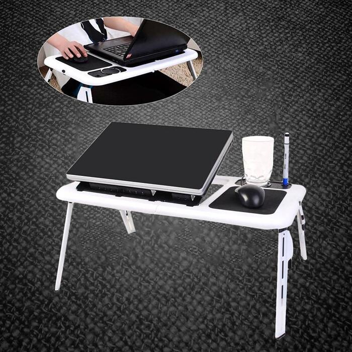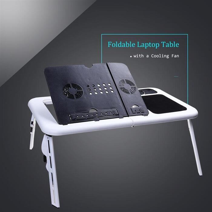 DescriptionThis surprisingly portable laptop table will bring you much convenience. It can efficiently and safely handle the whole frame of a laptop computer, giving its user an easier time when tapping at the keyboards. It features non-slip legs and the lower portion of the table top is equipped with appropriate stoppers so that the laptop will not fall down.Features- Color: Black, white.- Material: High-strength ABS plastic, Steel.- Adjustable Height: 0-31cm.- Adjustable Angle: 0-70 degree.- Design: Multi-angle adjustment, Non-slip legs.- Foldable in desk, small in volume.- Provided with two ultra-quiet fans and one USB cable, can be used as a cooler.- With a mouse platform and metal cores.- Ergonomic sleek design with multifunctional concept.