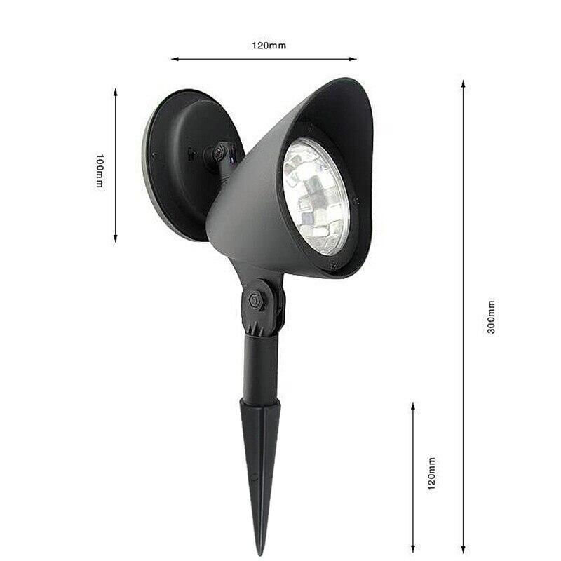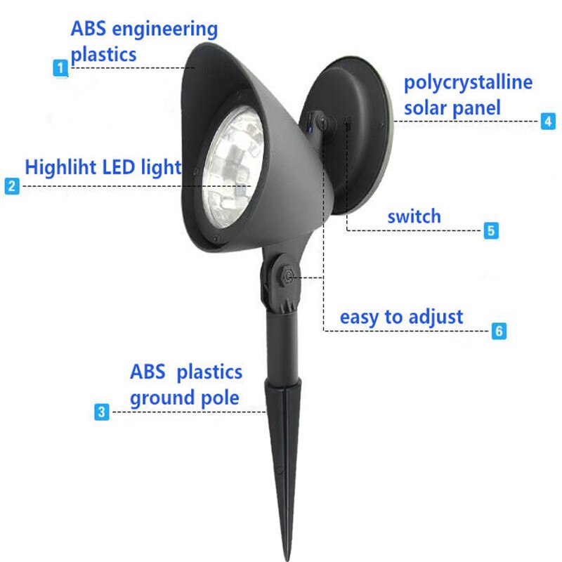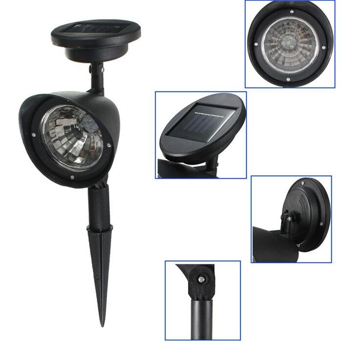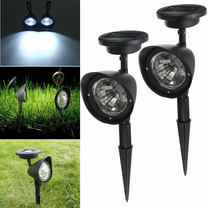 Features : -100% Brand New and High Quality. -Plastic construction and black finish Cordless -Low power consumption and energy-saving -Low voltage, no flicker, no glare -Simple design matches various landscapes and styles -Designed for all weather -Environmentally friendly -Automatic sensor activates at dusk -Auto On/Off -On/Off Switch (Turn the On button for the first time use) -Super bright and long-lasting, easy to install -Can be mounted vertically or horizontally. -Adjustable stand lets you point the light at different angles -Long-lasting LED bulb 100,000 hour technology Specifications: Weight:413g Solar Panel:2V/40mA Light color:white LED on each light : 4LEDs Package includes : 1 x Solar landscape lights