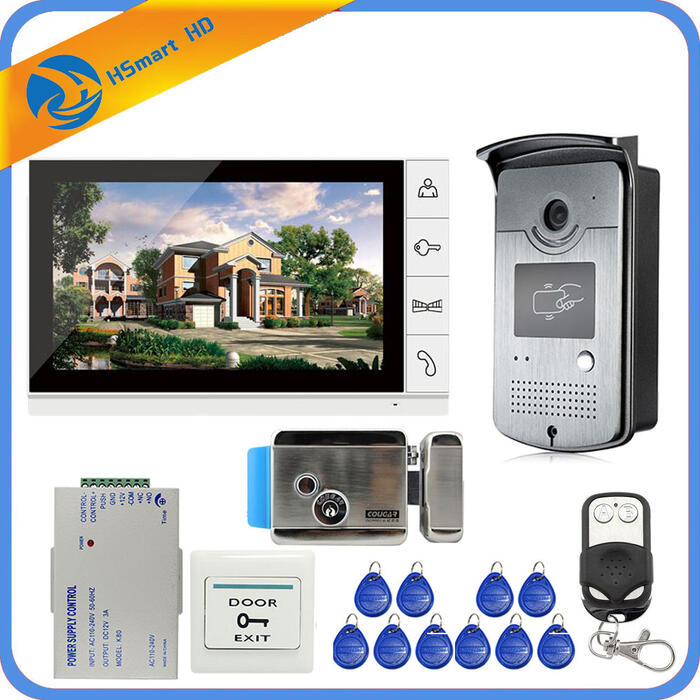 New Wired 9 inch Video Door Phone Intercom Entry System 1 Monitor 1 RFID Access IR 700TVL Camera Electric Control Door Lock