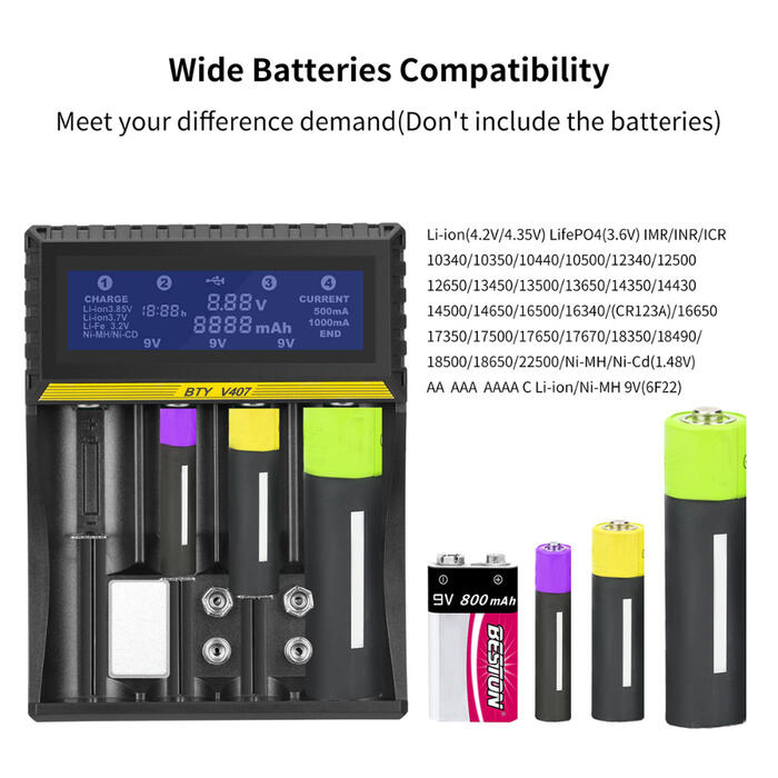 Compatible with batteries of Li-ion(4.2v/4.35v)9V(6F22)LiFePO4(3.6v),Ni-MH/Ni-Cd(1.48v) 9V(6F22)