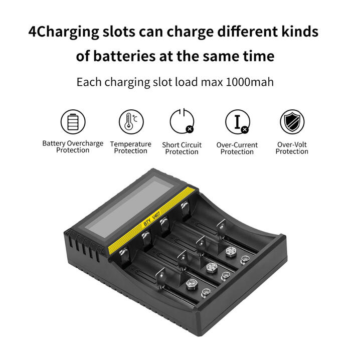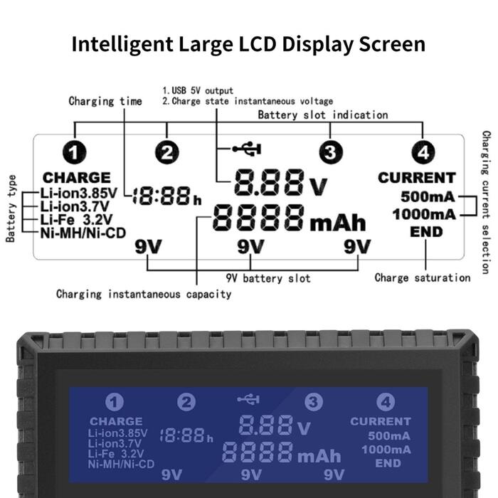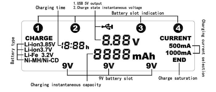 4charging slots can working for different type batteries in power charging time, each charging slot Provides 500mA and 1000mA charge current, 3 charging slots 9V(6F22) provides 100mA charge current