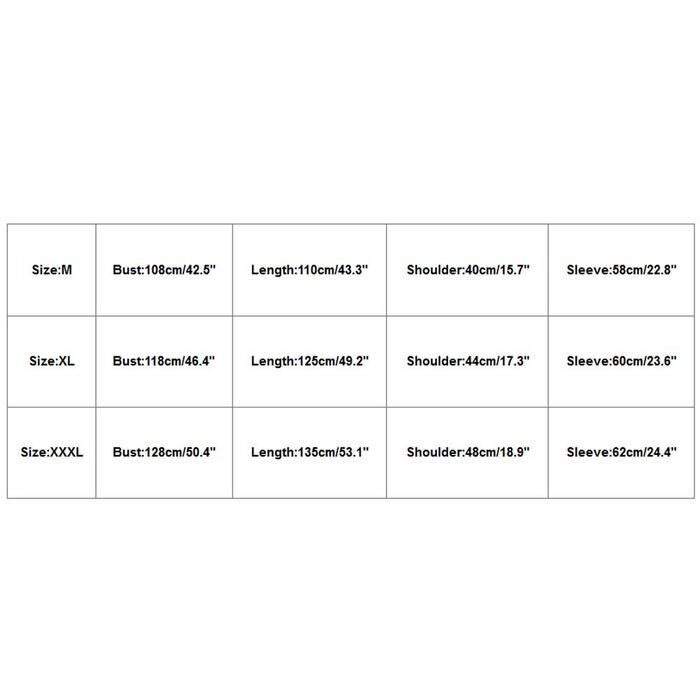 Size Bust Length Shoulder Sleeve M 108cm/42.5″ 110cm/43.3″ 40cm/15.7″ 58cm/22.8″ XL 118cm/46.4″ 125cm/49.2″ 44cm/17.3″ 60cm/23.6″ XXXL 128cm/50.4″ 135cm/53.1″ 48cm/18.9″ 62cm/24.4″