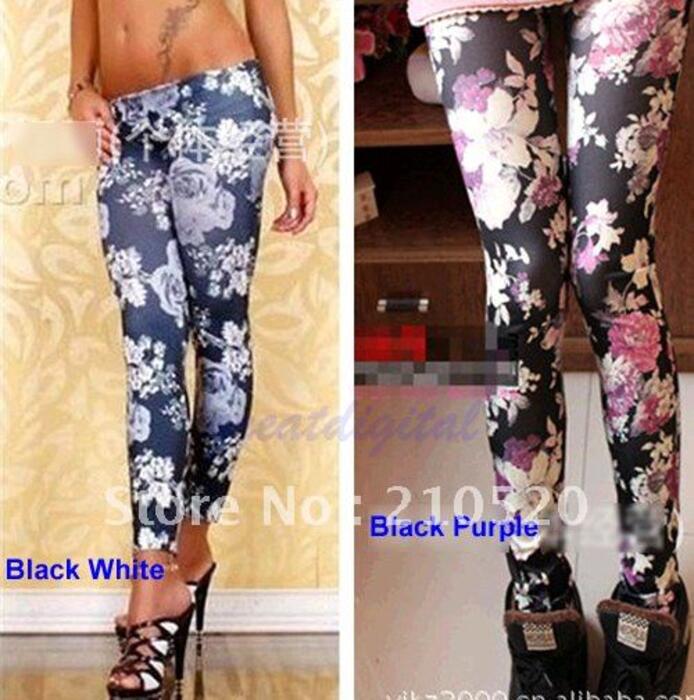 Free Shipping 3pcs/lot Fashion Women Sexy Black Rose Flower Graffiti Soft Stretch Leggings Tight Pants