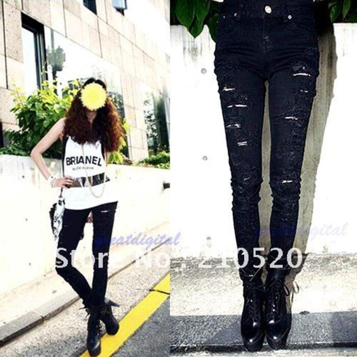 Free Shipping New Women Fashion Black Cut-out Skinny Punk Ripped Pants Jeans Leggings Trousers