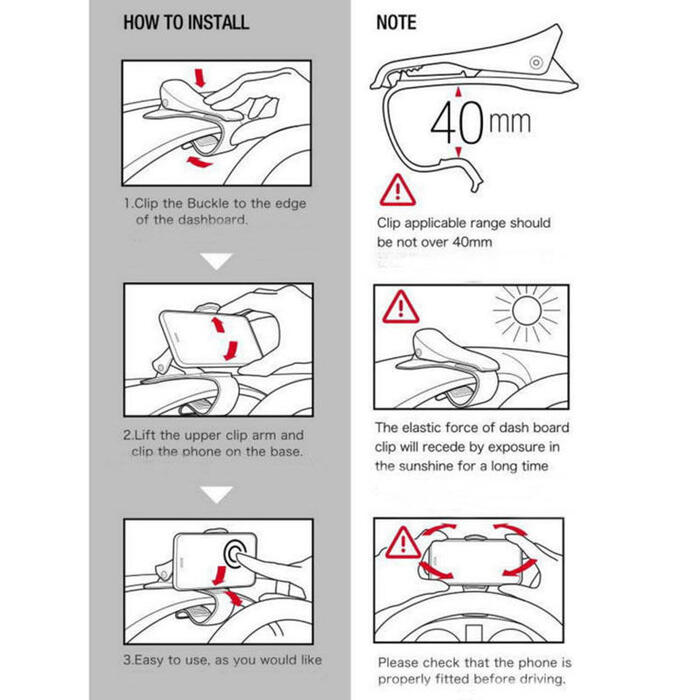 Specification: 100% brand new, high quality Suitable for: 3-6.5inch mobile phone/ PDA/ MP4 devices HUD design does not obscure driver s view, easy to operate, safer driving Fixed and stable Curved base design fasten to most car dashboard With non-slip silica gel does not scratch your car and phone Adjustable display angle Easy to install, no tools required Color: Black Package included: 1pc x Car Dashboard Holder