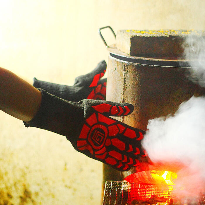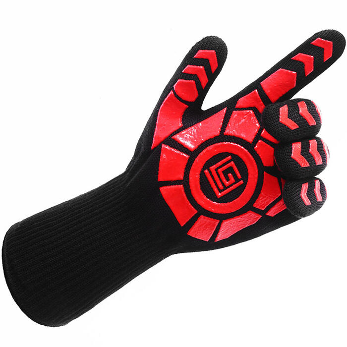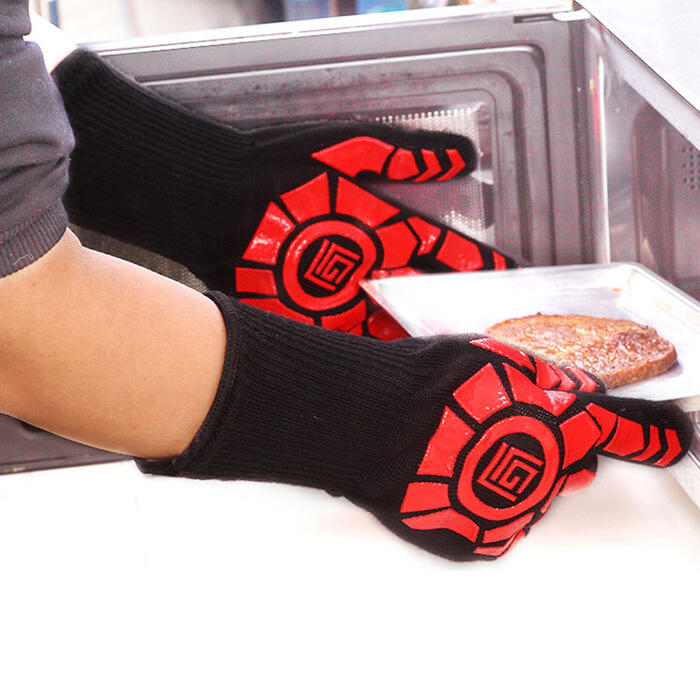 This cooking gloves adopt heat-insulated aramid fiber with high-strength aramid 1313 +aramid 1414 material and nontoxic food-grade silicone coated surface, high fire retardant with stand 0?,the grilling gloves are cooking mitts and potholders.