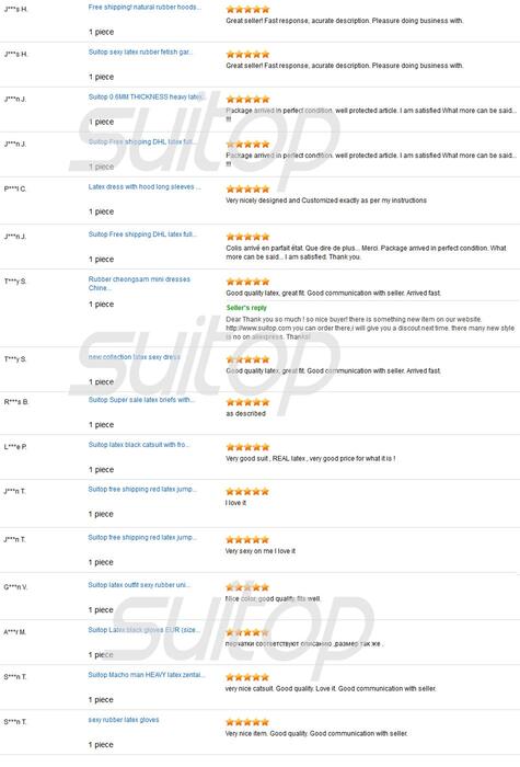 Want to Shine Your Latex Clothing? If you ve seen latex in photoshoots or clubs, it probably appears smooth and very shiny. When you first purchase an outfit, you may be disappointed to see that the latex appears to have more of a matte finish. Similar to leather, latex requires shining and care in order to look its best and develop a bright sheen. Return Policy If the product you receive is not what you ordered, we will replace it free of charge. All products are checked before and suitop guarantee the quality of our products. If a product fails to meet your expectations, simply contact us within 2 days We cannot be held responsible for damage caused by misuse or poor care of garments. All packages must be insured for the value of the contents when they are sent back to us. Suitop will not be held liable for any packages lost during the return process unless a proof of delivery signature can be provided. If you wish to exchange garments, or if there are any faults with your order, you must notify us in writing or by email within 2 days of receipt of your order for a return authorisation number. Orders cannot be cancelled once the transaction has been processed. Goods of an intimate nature are non-refundable and non-exchangeable once they have been opened. This includes underwear and bondage items and is in accordance with health and hygene regulations. Feedback We value and respect all our customers feedback ratings and reputations and will try our best to resolve any issues amicably before leaving negative/neutral feedback. Please show us the same courtesy and contact us first if you have any niggles. We do not generally leave feedback until the end of the transaction i.e. after the buyer has informed us they have received the item.