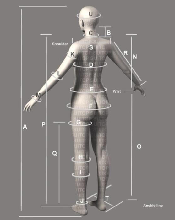 A Height B Neck length C Neck(around) D Bust E Waist F Hip G Thigh(around) H Knee(around) I Shank(around) J Ankle(around) K Upper arm(around) L Elbow (around) M Wrist (around) N Neck line to Waist line (Messure along bodyline) O Waist line to ankle line(Messure along bodyline) P Neck line to ankle line (N+O) Q Inseam (to the ankle)*not to the ground R Arm Length(shoulder bone to the wrist) S Shoulder Length (shoulder bone to shoulder bone) T Foot lenngth U Head Size(around) V Weight W Gender