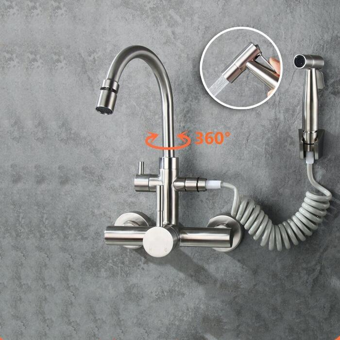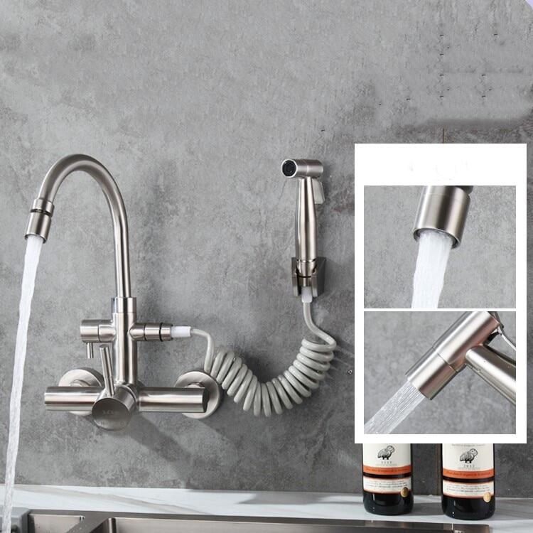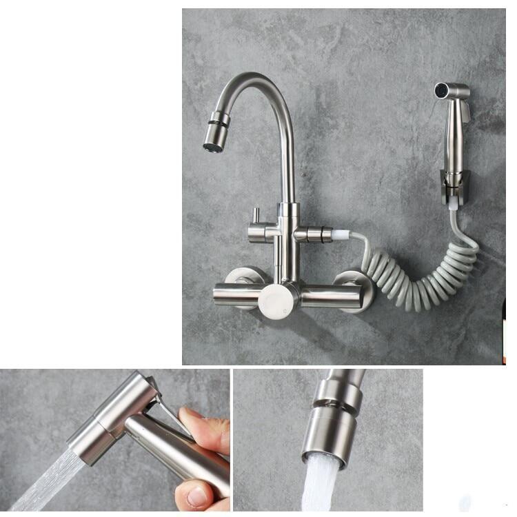 Wall mounted Brushed stainless steel kitchen faucet with bidet spray shower head ,Rotatable,Cold and hot water faucet
