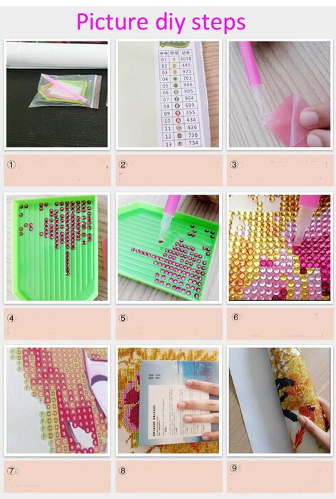 The drill step 1.Open the product suite,according to color lined up diamonds and organize all the tools. 2.When you start , only need lift a small part of the release paper, in order to avoid other regional sticky dust affect the 3.Paste the diamond into the corresponding grid (according serial number). 4. The diamond after Paste being completed, which makes diamond bonding surface more solid .after this step, your work is done! About the packing We in order to better protect the picture from the crease, we adopt the pearl bar scroll forms. Pearl bar in painting play a supporting role, won/ t cause the picture crease.It doesn/ t hurt, rest assured shopping. So far no customers reflect the scratches workshop Before your payment, please read the following content carefully, it will guarantee you a happy shopping trip. 1. Our company accepts the following transaction: Retail: we accept retail transactions from all customers all over the world. We do not set minimum limit for all commodities. Wholesale: we accept wholesale trading from all customers all over the world. In order to relieve your inventory pressure, the batch we set is greater than or equal to 2 pieces. if you want a large quantities of wholesale, please contact with us, we will discuss the wholesale price, the mode of transportation and so on with you. We believe that we can reach a satisfactory agreement. Delivery agent: if you are foreign online sellers, we can provide agent service for you. Please clearly tell us your buyer / s address information when trading, we will struggle to be of service to you at the same time, and we will fully respect your business secrets, never doing anything detrimental to the interests of your behavior. If your country and area are not within the country of free , you can contact with us, we will provide you with the best method. 2. Transportation: Our goods are from mainland China. After your successful payment, we will deliver goods within 3-5 working days, your goods will usually arrive in 7 to 50 working days. In rare cases, it is likely to delay which depends on the weather and pass speed of your country and the goods. When the goods sent, we will actively follow up your goods transport state. We usually use China Post small packet for your transport, under normal circumstances, goods will be delivered in 15-30 days. But there are other cases may be delayed, for example, bad weather delayed arrival in your country and postal system delays dispatch of the local post office and so on. Therefore, China Post parcel delivery time is a maximum of 50 days. For forwarding customers, We can also use the ZTO Express for your transport, usually within 30 days can be served. 3. The tariff: After the goods arrived in your country, it may produce certain tariffs in some countries. This part of the tariff needs to be paid by you . We will mark it as gift or lower the value of goods for you to save a part of customs fees. 4. After-sales service: The all goods we sell are inspected strictly. If you find the goods you received has quality problem (non-artificial damage) within 3 days. Please take pictures and contact with us, we will change or refund for you. 5. Feedback: Your satisfaction is very important for us. If you are satisfied with your goods, please give us positive feedback. If you are not satisfied with goods, please contact with us, we can solve any dispute with you instead of submitting negative feedback to . Thank you very much.