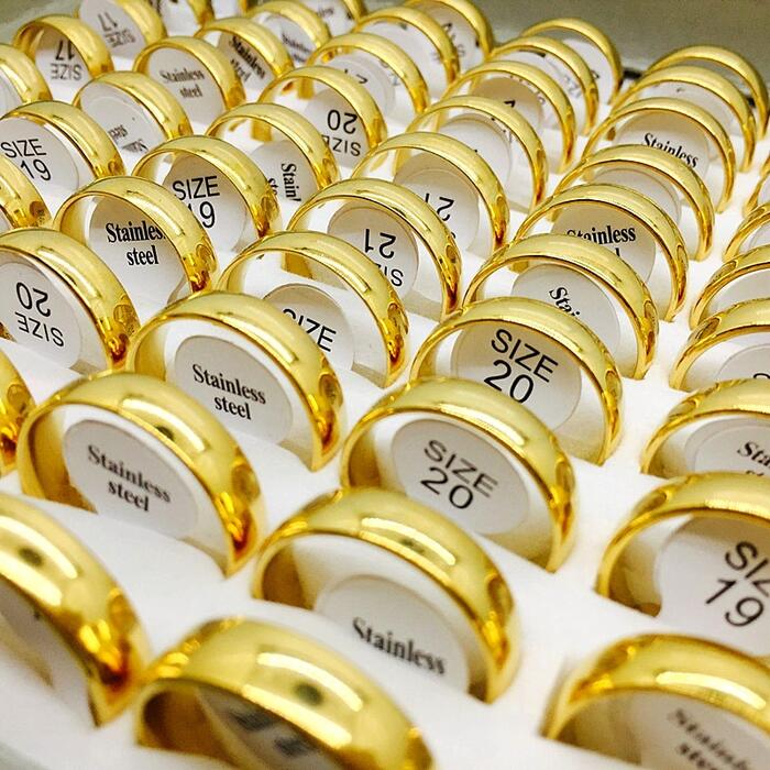 wholesale bulk lots 50pcs/pack men s women s stainless steel Jewelry engagement wedding Rings Material: stainless steel Size: 17-18-19-20-21mm Quantity: 50pcs/lot Style: as shown in the pictures,width 6mm Packing: Original Packaging Colors: Gold