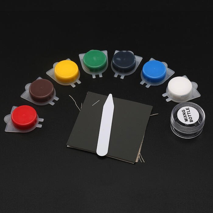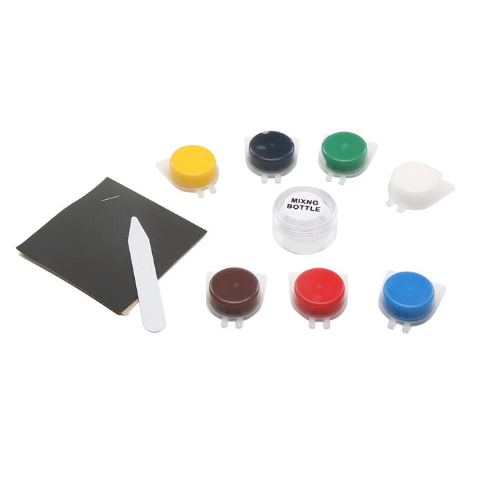 Leather and vinyl seats, dash, car top, trim, panel, chair, sofa, vinyl floor, belt, clothing, purse, footwear, marine upholstery, steering wheel, luggage replacement worldwide. Kit contains: intermixable colors (black, blue, green, red, white and yellow) grain paper, backing fabric, spatula and a mixing bottle.