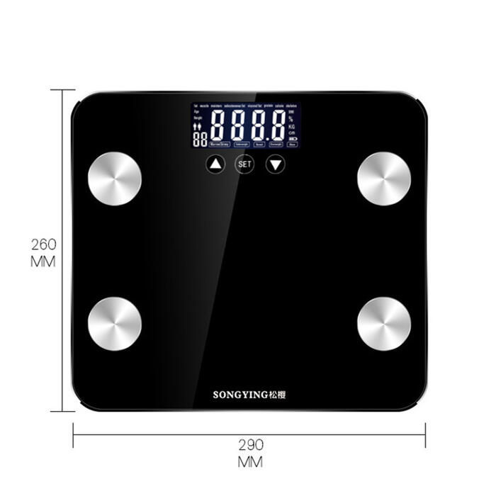 Specification: Colour: Black Size: 290 x 260MM LCD Size: 67 x 29MM Unit: lb/kg Division value: 50g Power supply mode: 2 x AAA Battery (battery does not included ) Material: Toughened Glass Intelligent Power-on: Automatic shutdown Weighing Range: 5-180KG Weight:About 1.1kg