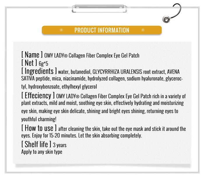 OMY LADY collagen Fiber Complex Eye Gel Patch rich in a variety of plant extracts , mild and moist , soothing eye skin , effectively hydrating and moisturizing eye skin , making eye skin delicate , shining and bright eye shining , returning eyes to youthful charming .