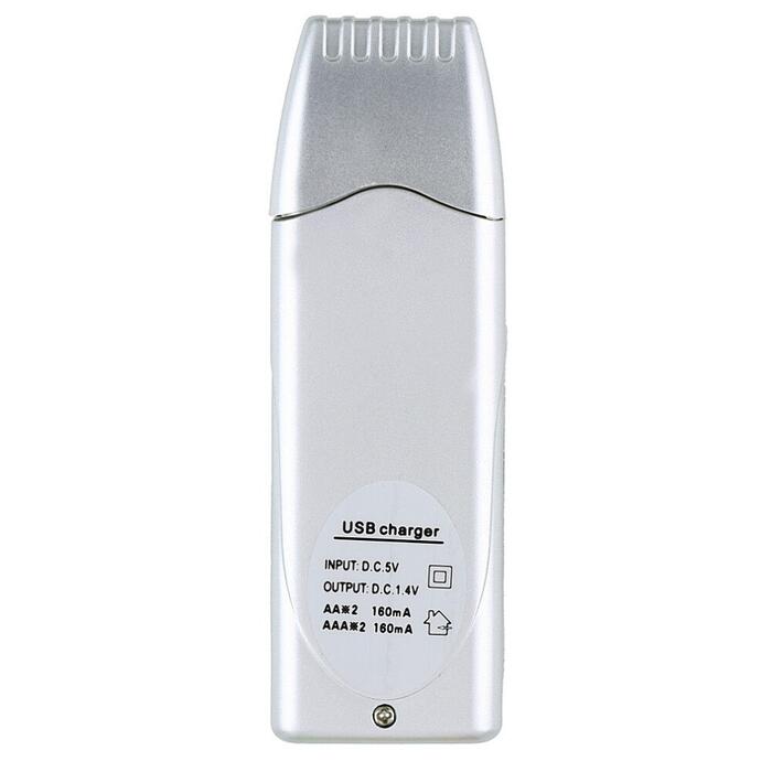Features: Rechargeable NiMH Battery and AA high capacity USB Charger New Recharges high capacity Ni-MH AA and AAA batteries Safe and efficient use of energy Very convenient and easy to use Input:D.C.5v Output:D.C.1.4V Specification: Size:10.5 x 3.4 x 2 cm Net weight: 28g Package weight: 34g Original box: NO Color: Silver Packing content: 1 x NiMH USB Charger