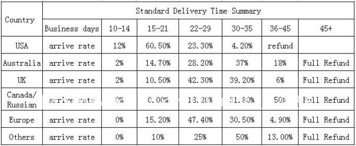 order< $7,we will send them out by China Post Ordinary Small Packet Plus (24 countries ). Order > $10 United States country,we will send them out by E pack,it usually takes about 15-25 days arrive.