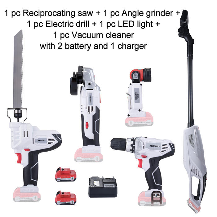 This is a link for the power tools set of a pcs of Electric drill, a pcs of Angle grinder, a pcs of Vacuum cleaner, a pcs of Electric saw and a pcs of Led light. They share with two lithium battery and one charger.