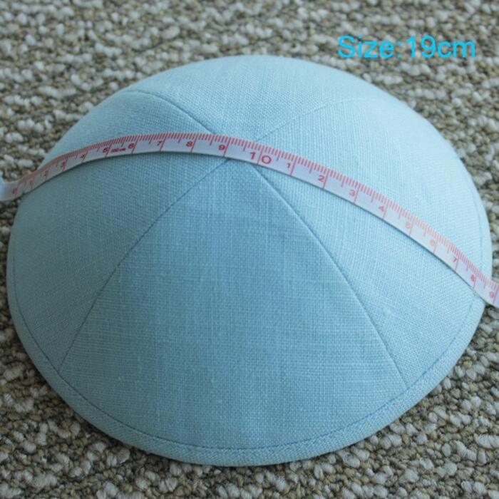 This kippot is made of fabric which looks like linen, but the material is chemical fibre in silver gray color and lined with white cotton twill fabric.