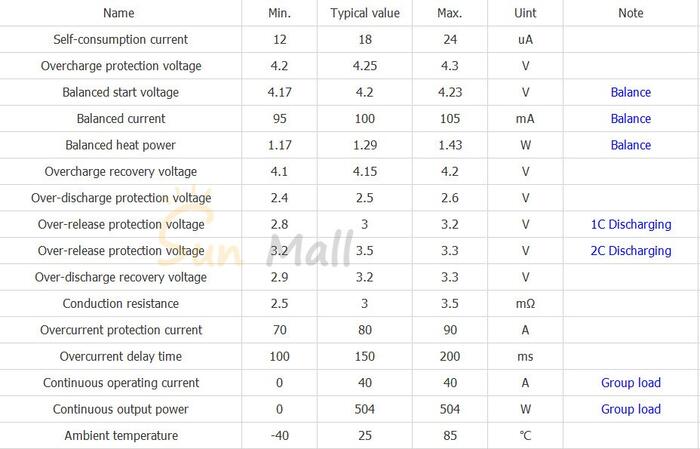 Scope: Nominal voltage of 3.6V, 3.7V lithium battery (including 18650,26650, polymer lithium battery) Product Size: 42 * 60 * 3.4mm (balanced version) Product weight: 9.8g (balanced version) Charging voltage: 12.6V – 13.6V Continuous discharge current (upper limit): 40A (if the cooling environment is not good, please reduce the load current use) Continuous charge current (upper limit): 20A Balance version: suitable for starting current below 80A, power 135W below the drill.