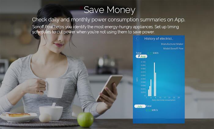 Sonoff Pow, therefore, allows users calculate electricity bill, figure out which appliances consume the most power so they can easily cut down electricity bill.