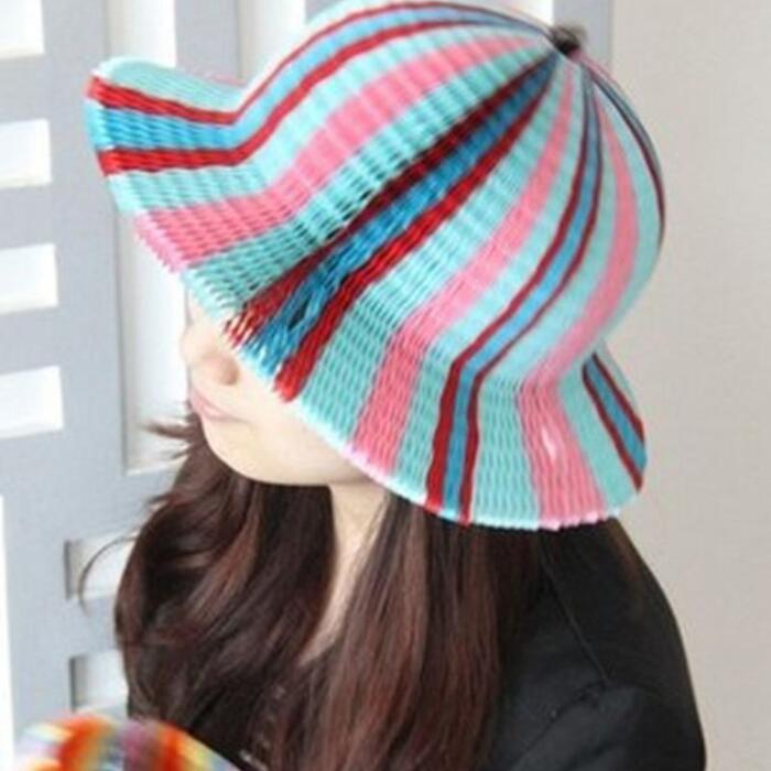 Contrast rainbow colorful stripes design, hollow out honeycomb folding hat, random delivery.