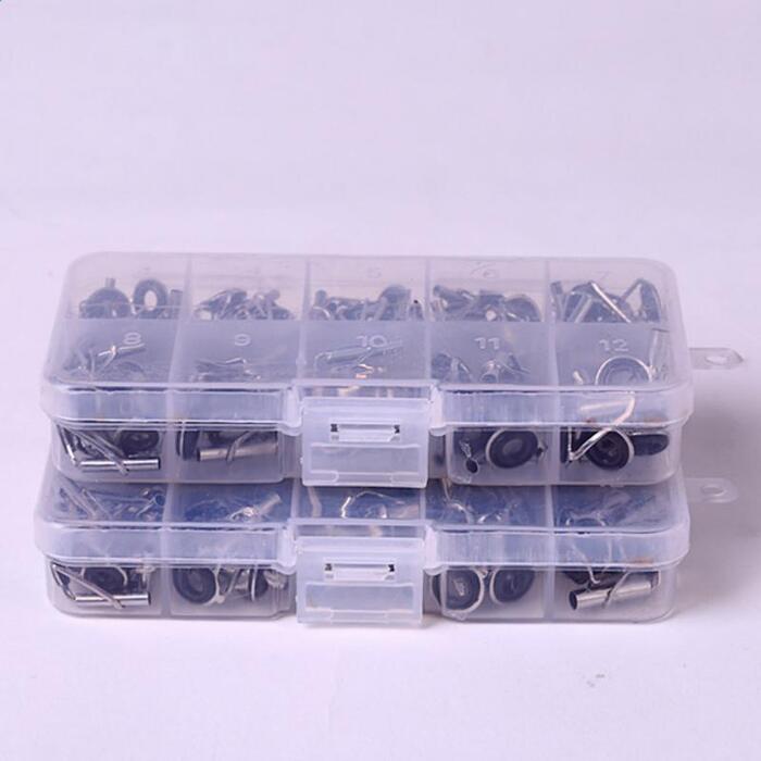 Package includes: 10 x #3 Fishing Rod Guide 10 x #4 Fishing Rod Guide 10 x #5 Fishing Rod Guide 10 x #6 Fishing Rod Guide 10 x #7 Fishing Rod Guide 10 x #8 Fishing Rod Guide 5 x #9 Fishing Rod Guide 5 x #10 Fishing Rod Guide 5 x #11 Fishing Rod Guide 5 x #12 Fishing Rod Guide 1 x Plastic Box