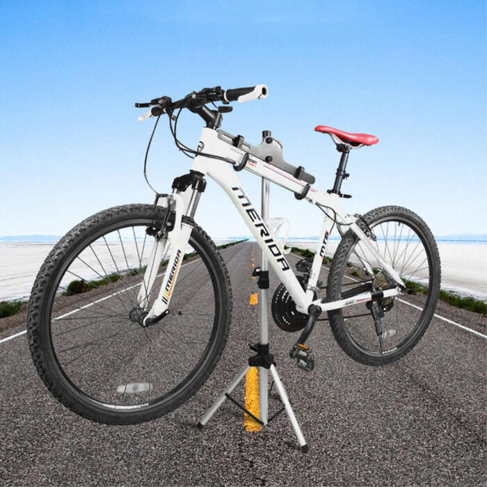 Are you still annoyed by the inconvenience of repairing your bike? The professional bicycle repair stand is so versatile, you can mount your bike in almost any position and lock it in place with a simple twist of a knob or two. The adjustable handlebar rod stabilizes the front wheel for easier repairs.Features- Color: As shown. – Material: Aluminum Alloy. – Size: About from 70 cm to 132 cm in length. – Maximum capacity of 110 lbs / 50 kg due to heavy duty construction. Predrilled holes in feet for anchoring to surfaces. – Clamps hold tight but won t damage your bike s finish, rotates 360 degrees for easy access to every part of your bike. – Adjustable handlebar rod stabilizes the front wheel, legs fold up for easy storage or transport. – Convenience, Super easy setup and assembly. – Particularly suitable for car shops, clubs, dealers and bicycle enthusiasts.Packing list