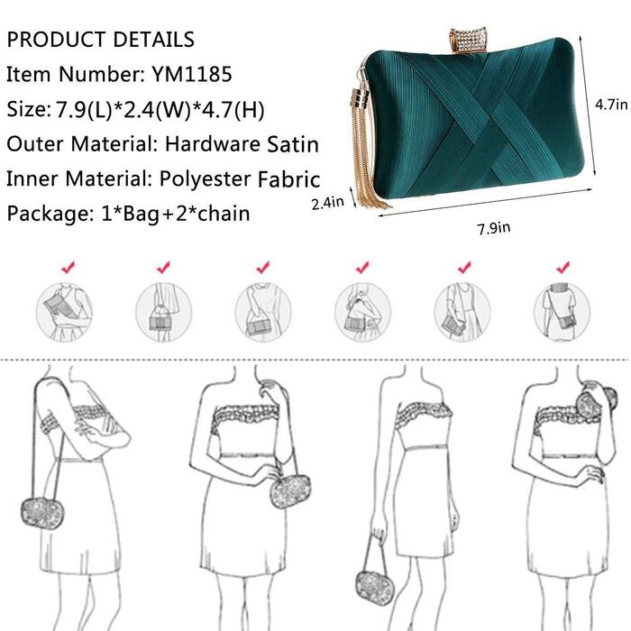 High Quality Material: This Clutch Bag Outer Material Is Made of imitation silk,Satin and synthetic leather.Inner Material is Polyester Fabric.Very Charming and Elegant Multiple Uses: This Bag Can Be Used As Evening Bag,Cluth Purse,Handbag,Shoulder Bag,Cross-Body Bag,Comestic Bag Very Multifunction. Large Capacity: This Evening Purse is Easy to Hold Phone,Car Keys,Creadit Card,Cash,Small Wallet,Lipstick,Some Makeups and a Few Small Items. Any Occasion: Perfect for Go Dating,Go Shopping,Wedding,Prom,Party,Daily Life,Weekend,Evening Party,Cocktail Party,Birthday Party,Christmas Party and Other Special Occasion. 1.Gender: Women 2.Size: 20*12*6cm 3.Material: imitation silk + polyester + synthetic leather 4.Capacity: Phone (6in or Smaller)/Small Wallet/Mirror/Lipstick/Makeups/Cash/Credit Card/Car Keys/Small Items. color: dark green Package Included: 1 x Clutch Bag 1 x 46.5 inch Long Chain Strap Only the above package content, other products are not included. Note: Light shooting and different displays may cause the color of the item in the picture a little different from the real thing. The measurement allowed error is +/- 1-3cm.