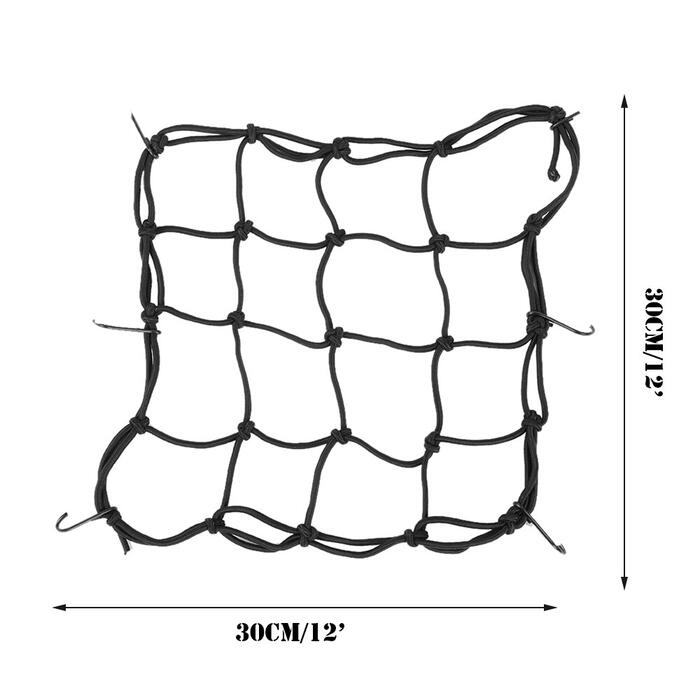 The cargo net measures approximately 30 x 30cm (11.8 x 11.8″) when not stretched. It will stretch up to approximately 3X that amount
