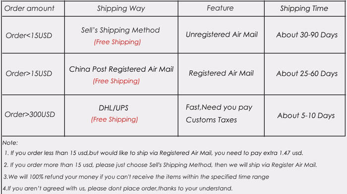 1.Shipping method: Free order will be shipped by China Post Ordinary Small Packet Plus. But if order amount more than USD200.00,we will ship by DHL or EMS free which arrive within 3-12 days;